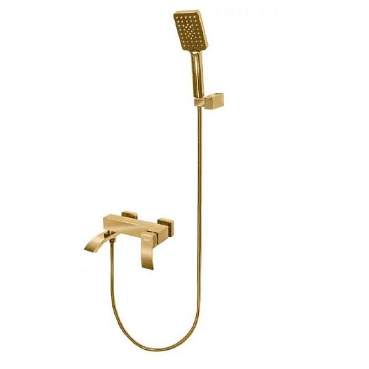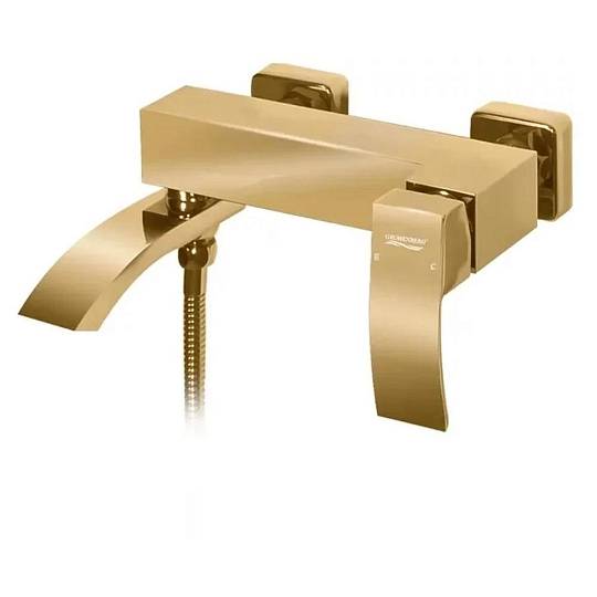Смеситель для ванны Grocenberg GB8007GO, золото. Стилистика дизайна: современный стиль. Монтаж: настенный. Излив: традиционный поворотный. Управление: рычажное. Исполнение шланга: металл. Комплектация: смеситель, шланг, душевая лейка, держатель душевой лейки, эксцентрики, отражатели.