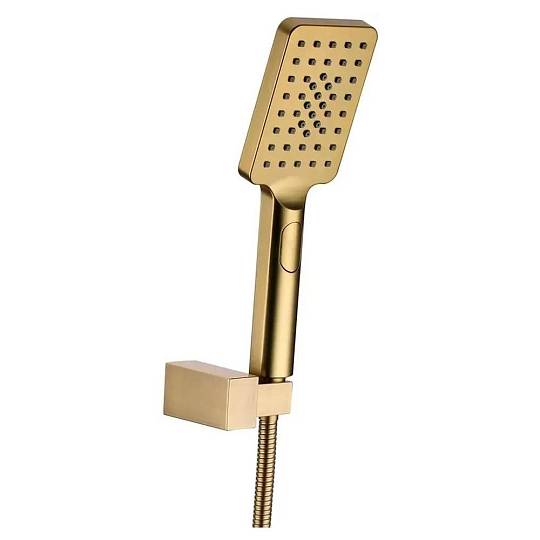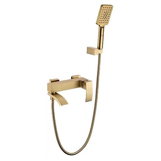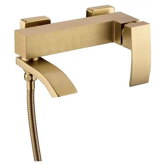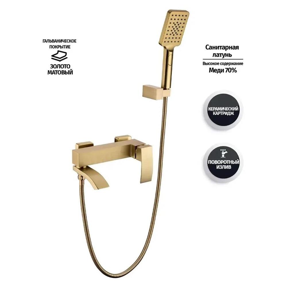 Смеситель для ванны Grocenberg GB8007MG, матовое золото. Стилистика дизайна: современный стиль. Монтаж: настенный. Излив: традиционный поворотный. Управление: рычажное. Исполнение шланга: металл. Комплектация: смеситель, шланг, душевая лейка, держатель душевой лейки, эксцентрики, отражатели.