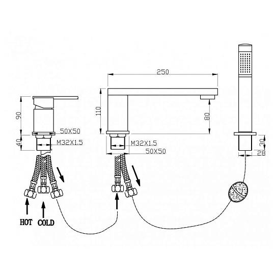 Смеситель имеет 3 монтажных отверстия, что позволяет установить его максимально удобно. Душевой шланг длиной 150 см обеспечивает комфортное использование.