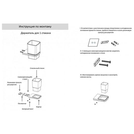 Объем стакана - 250 мл. Держатель изготовлен из высококачественной нержавеющей стали, с надежным покрытием. Держатель крепится к стене на шурупы (входят в комплект поставки).
