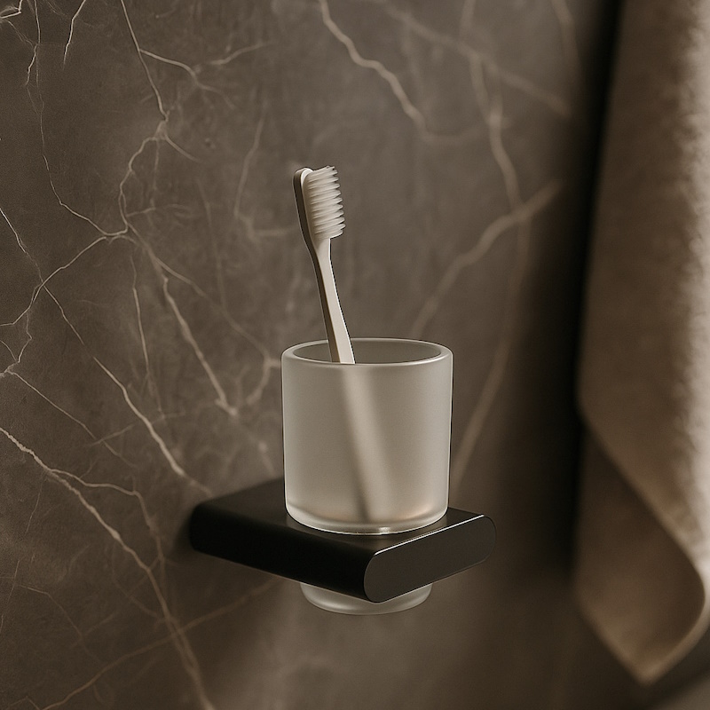 Современный подвесной стакан OVAL в матовом черном цвете с матовым стеклом. Удобный настенный монтаж освобождает пространство, а надежный сплав ZAMAK с антиследовым покрытием сохраняет безупречный вид.