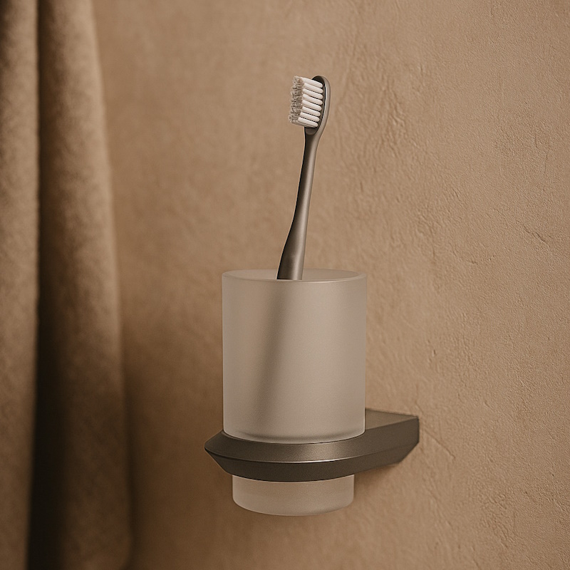Подвесной стакан SPACE с отделкой «оружейная сталь» и матовым стеклом. Настенный монтаж делает интерьер аккуратным, сплав ZAMAK + SUS-201 и антиследовое покрытие гарантируют надежность и легкость ухода.