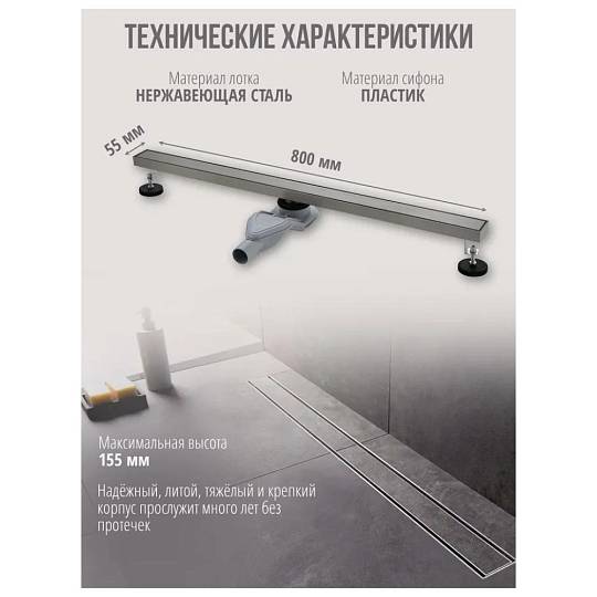 В комплект входит трап, ножки, сифон, набор для монтажа.