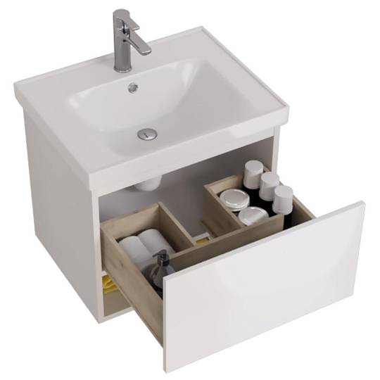 Тумба под раковину подвесная Dreja Perfecto 60 см, белый. Фурнитура: Hettich. Компоновка: 1 ящик. Дополнительные функции: встроенный органайзер в верхнем ящике, механизм открывания  push-to-open. Монтаж: подвесной.