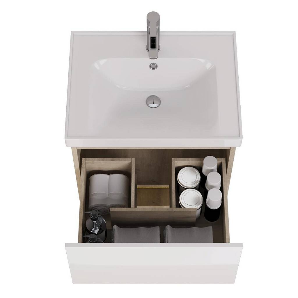 Тумба под раковину подвесная Dreja Perfecto 60 см, дуб эврика/белый. Фурнитура: Hettich. Компоновка: 1 ящик. Дополнительные функции: встроенный органайзер. Монтаж: подвесной.
