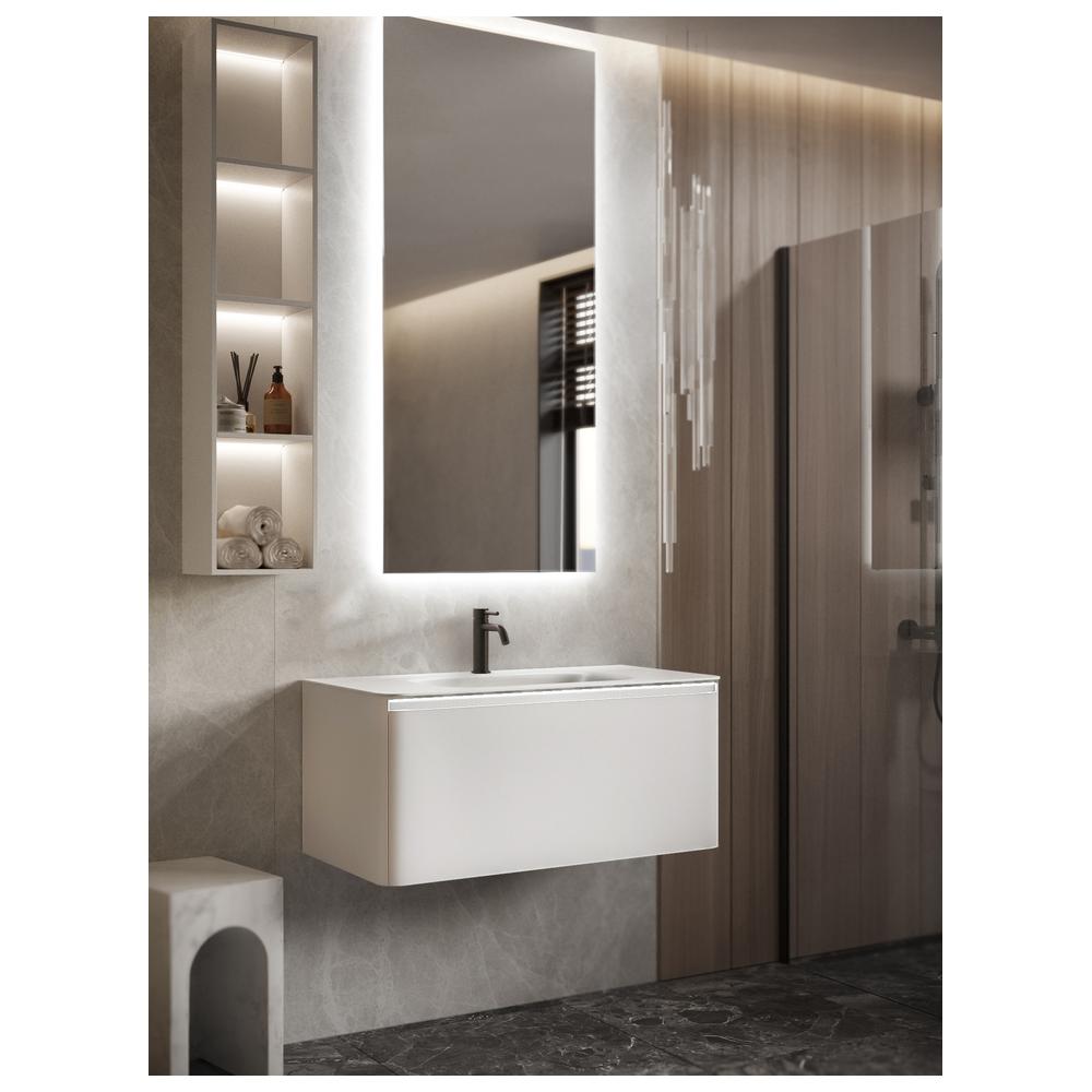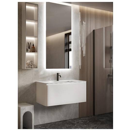 Подвесная тумба из МДФ с двусторонним эмалевым покрытием в матовом белом цвете станет стильным акцентом современного интерьера. Встроенная LED-подсветка 4000К с датчиком движения автоматически включается и выключается, а ящики из ЛДСП с направляющими полного выдвижения Soft Close (350 мм) обеспечивают удобство и плавное, бесшумное закрывание.
