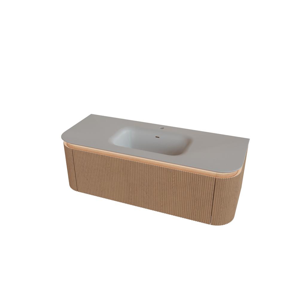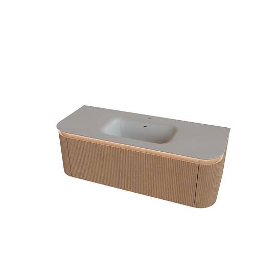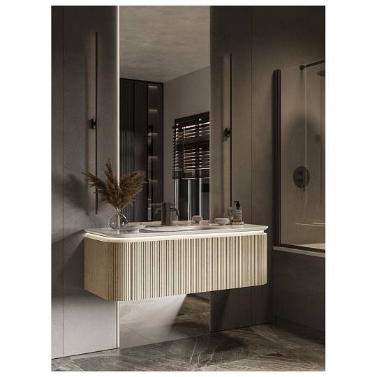 Подвесная тумба из фанеры, шпона и МДФ с рифленой поверхностью сочетает натуральную эстетику светлого дерева и выразительную фактуру, создавая стильный акцент в интерьере. Встроенная LED-подсветка 4000К с датчиком движения автоматически включается и выключается, а ящики из ЛДСП с направляющими полного выдвижения Soft Close обеспечивают плавное и комфортное использование зоны хранения.