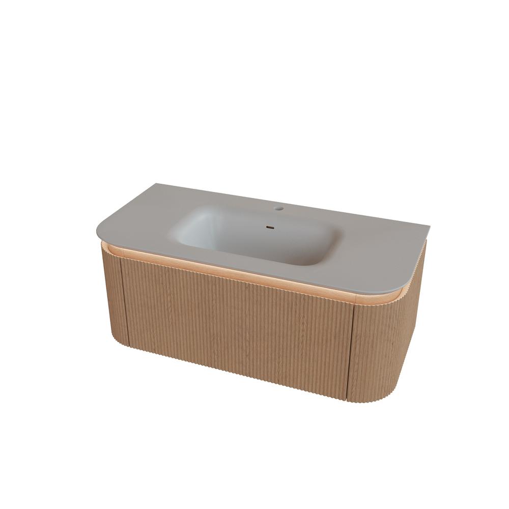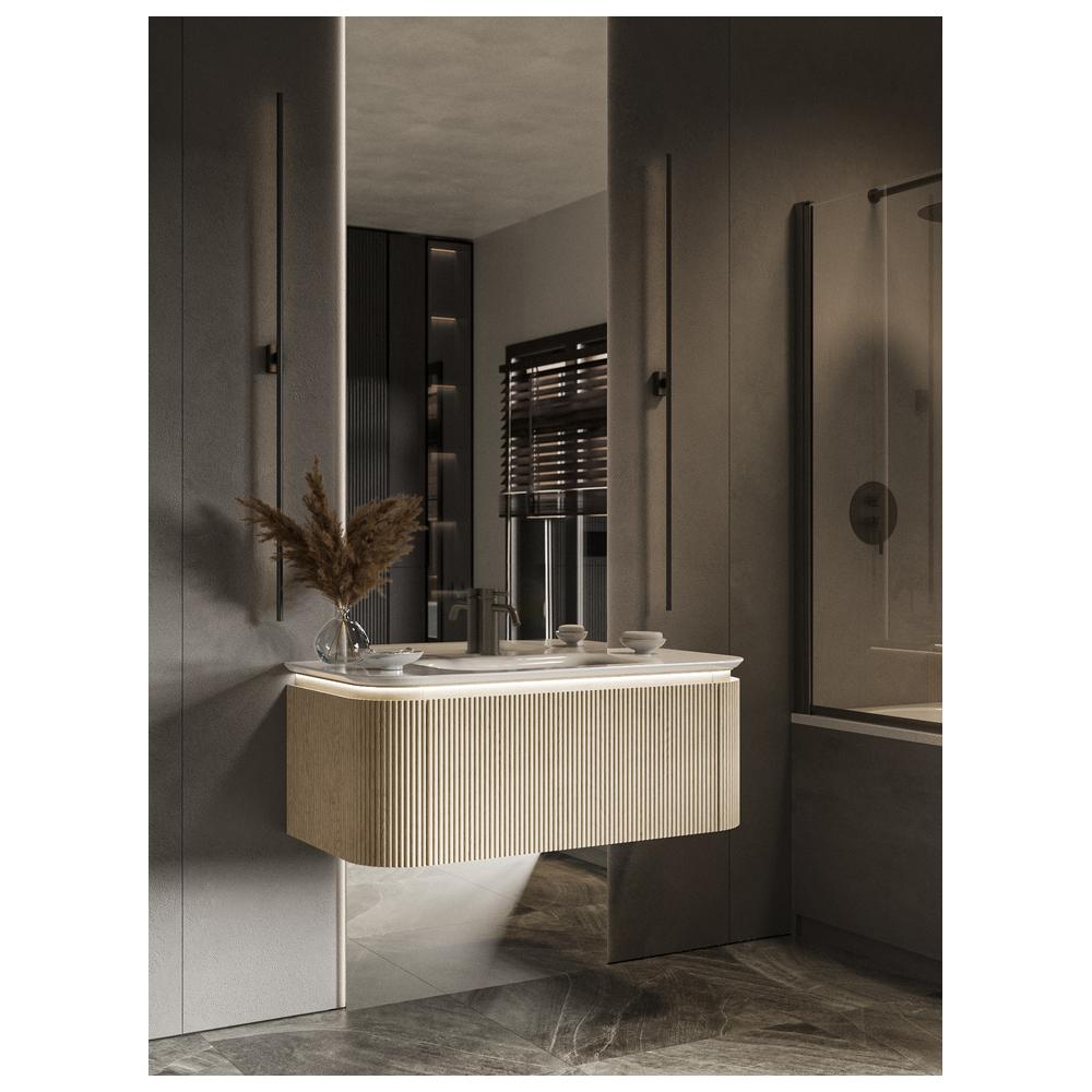 Подвесная тумба из фанеры, шпона и МДФ с рифленой поверхностью сочетает натуральную эстетику светлого дерева и выразительную фактуру, создавая стильный акцент в интерьере. Встроенная LED-подсветка 4000К с датчиком движения автоматически включается и выключается, а ящики из ЛДСП с направляющими полного выдвижения Soft Close обеспечивают плавное и комфортное использование зоны хранения.