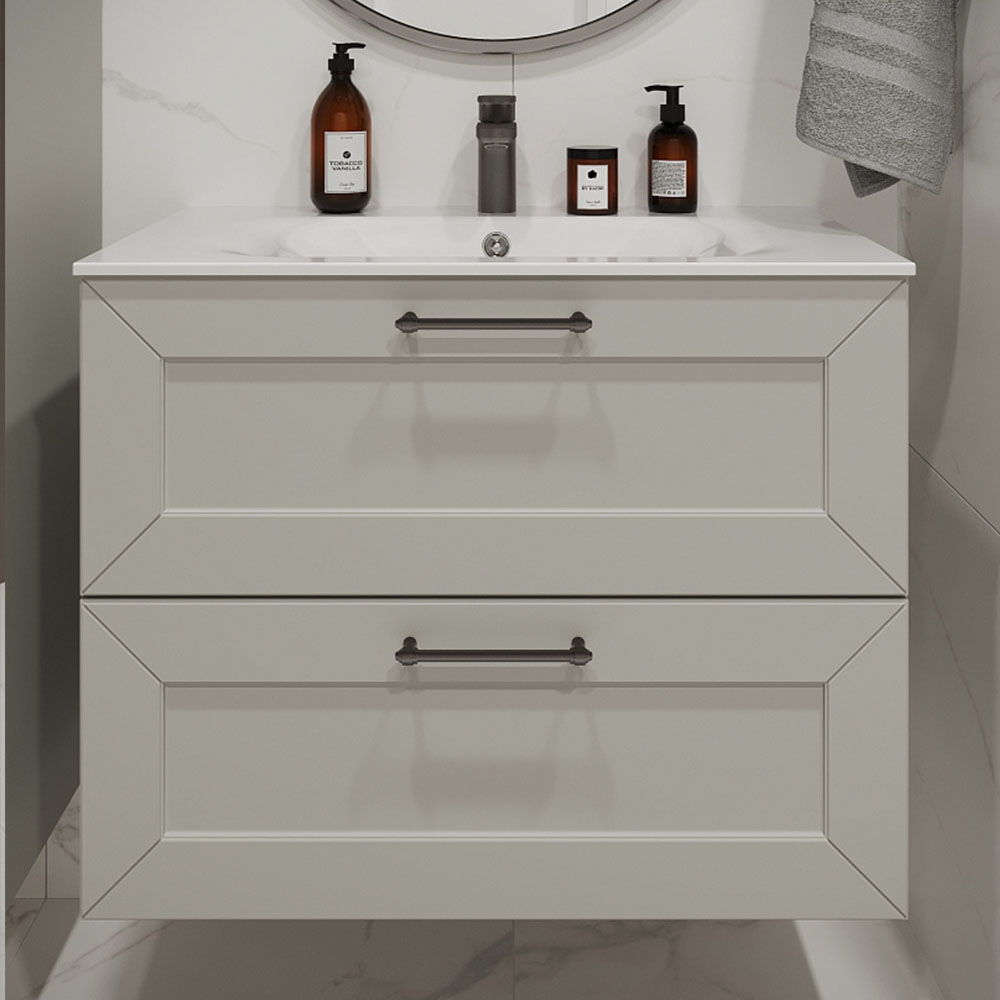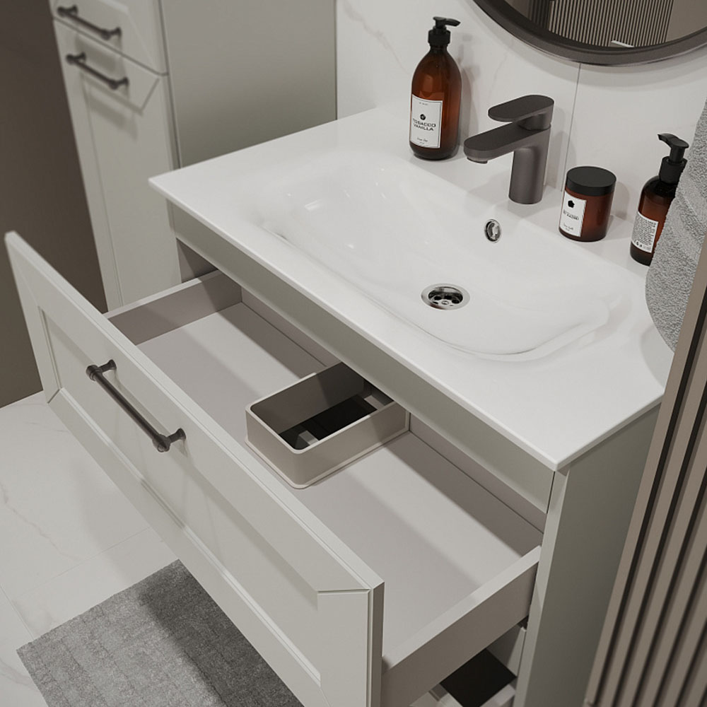 Тумба с раковиной подвесная (80см) Terminus Victoria VIC10802900301O, белый. Раковина из литьевого мрамора в комплекте: диаметр отверстия под смеситель: 35, диаметр отверстия слива: 45 мм, диаметр отверстия перелива: 30 мм. Ширина тумбы: 800 мм. Тип фасада: Филенчатая фрезеровка . Материал ящиков: ДСП. Количество ящиков: 2. Сифон и данный клапан приобретаются отдельно и в комплект поставки не входят. В тумбе установлена фурнитура Firmax. Система открывания: Металлические ручки . Технология направляющих: Soft-Close, полного выдвижения, с доводчиком. Тумба поставляется в сборе. Гарантийный срок 2 года.