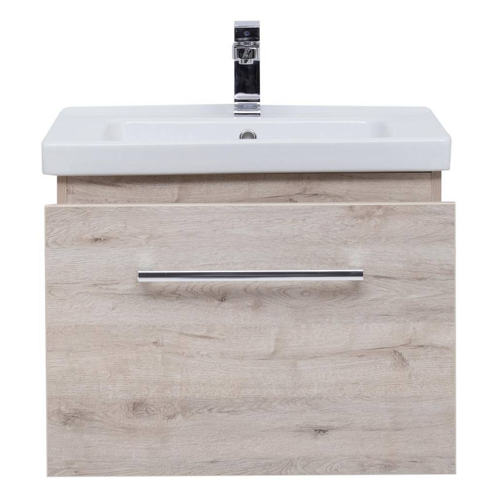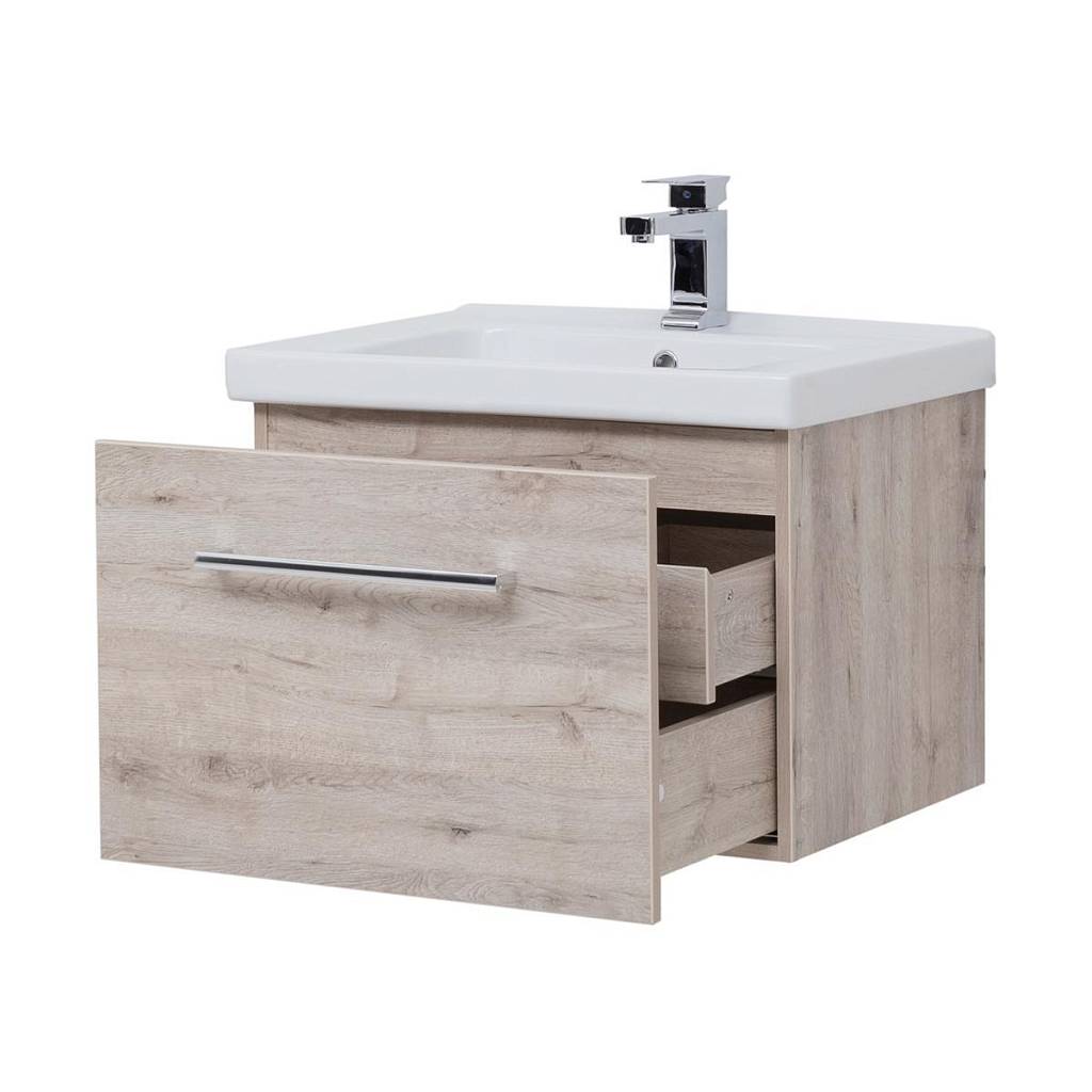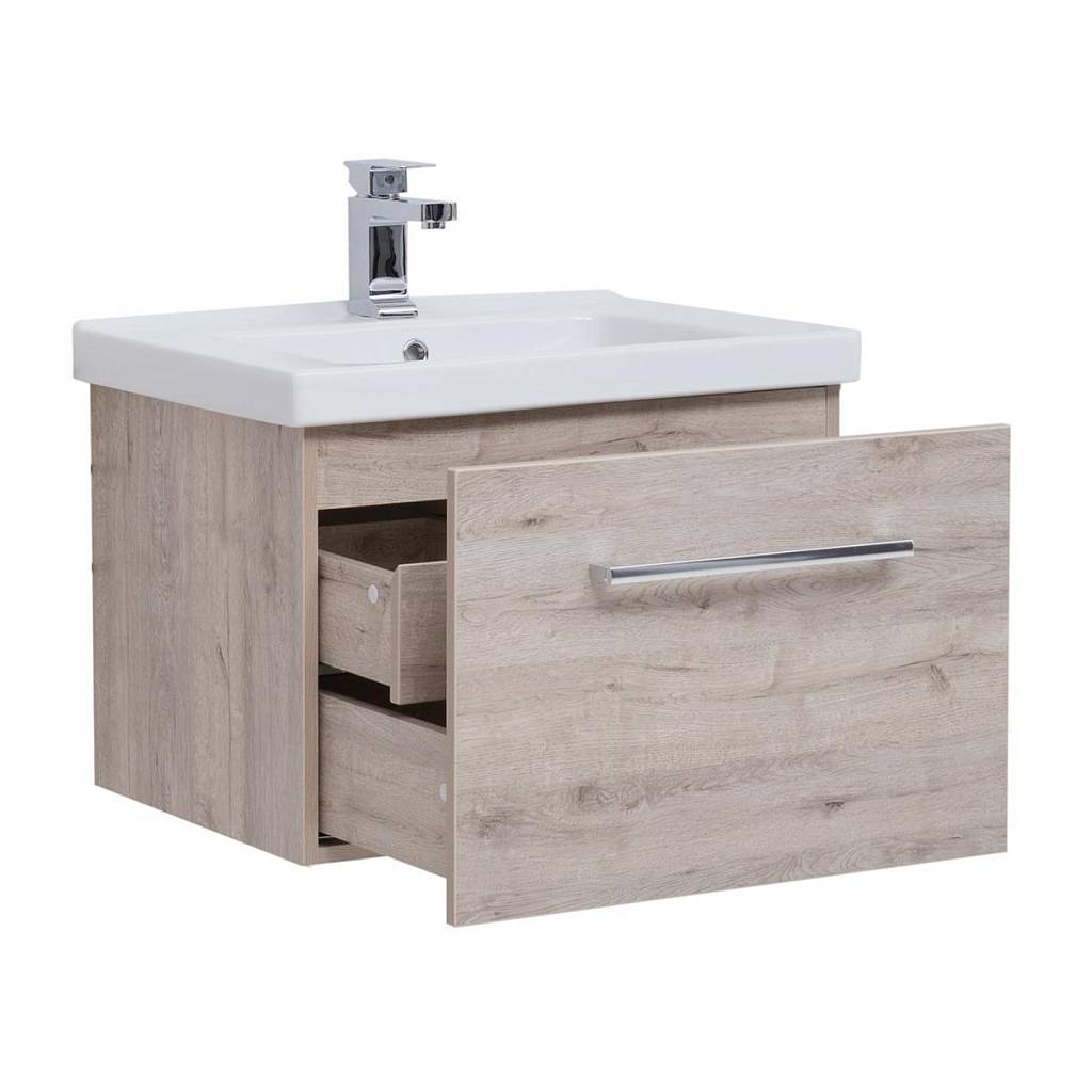 Тумба под раковину подвесная Dreja Big Inn 65 см, дуб кантри. Фурнитура: Hettich. Компоновка: 1 ящик + выдвижной внутренний ящик. Дополнительные функции: встроенный органайзер в верхнем ящике. Монтаж: подвесной. Раковина арт.: 640214 в комплекте.