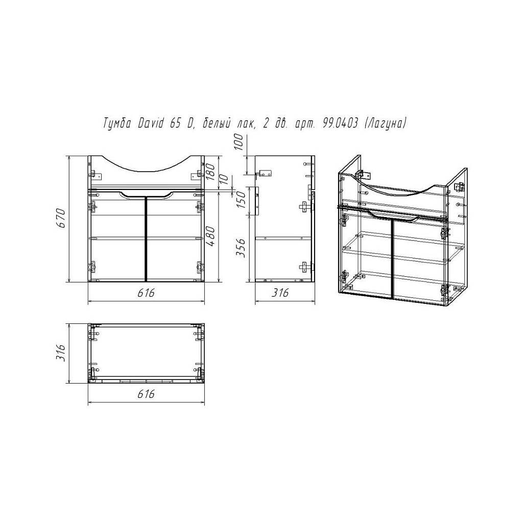 Тумба под раковину подвесная/напольная Dreja David D 65 см, белый. Фурнитура: Hettich. Компоновка: 2 дверцы. Монтаж: подвесной/напольный. Возможен напольный монтаж - необходимо отдельно приобрести ножки Dreja арт.: 99.9811. Раковина арт.: 192529 в комплекте.