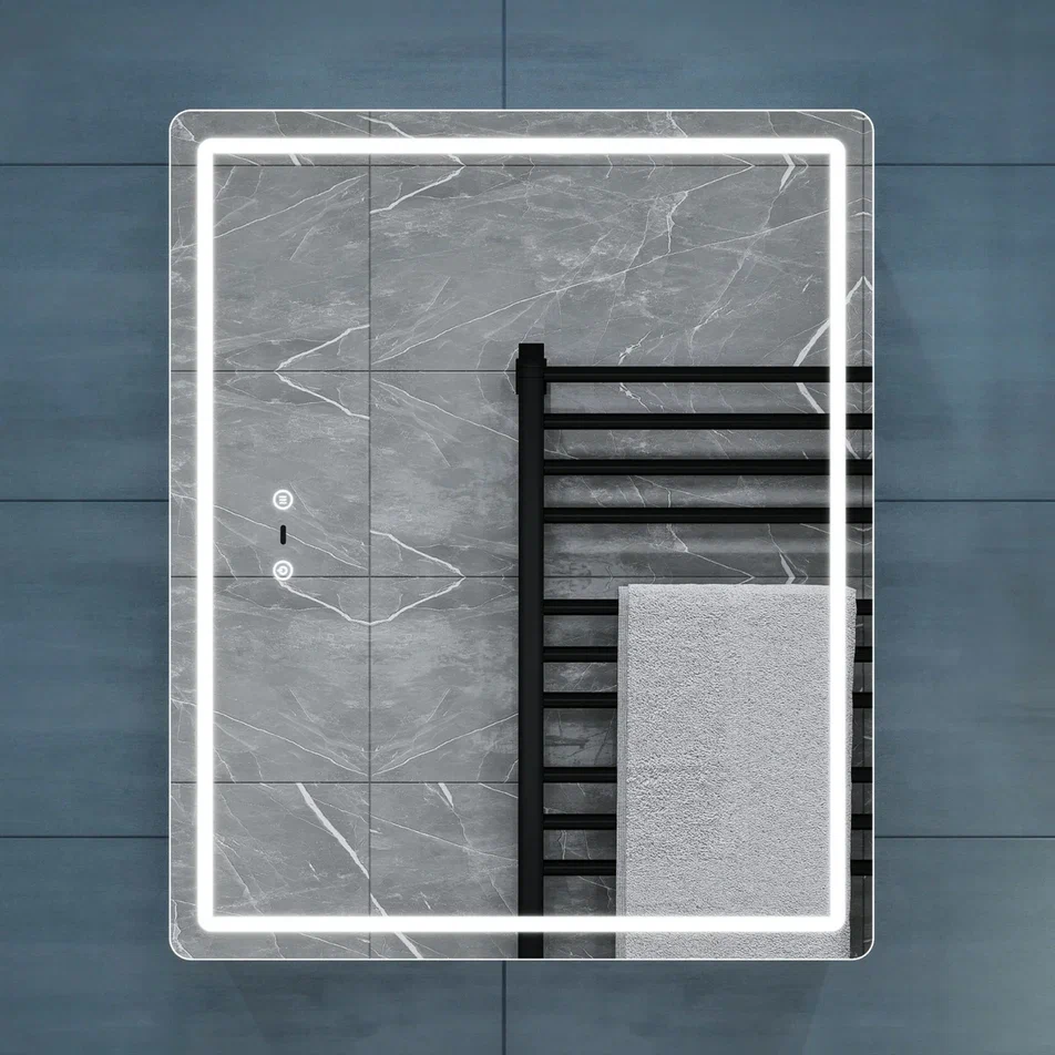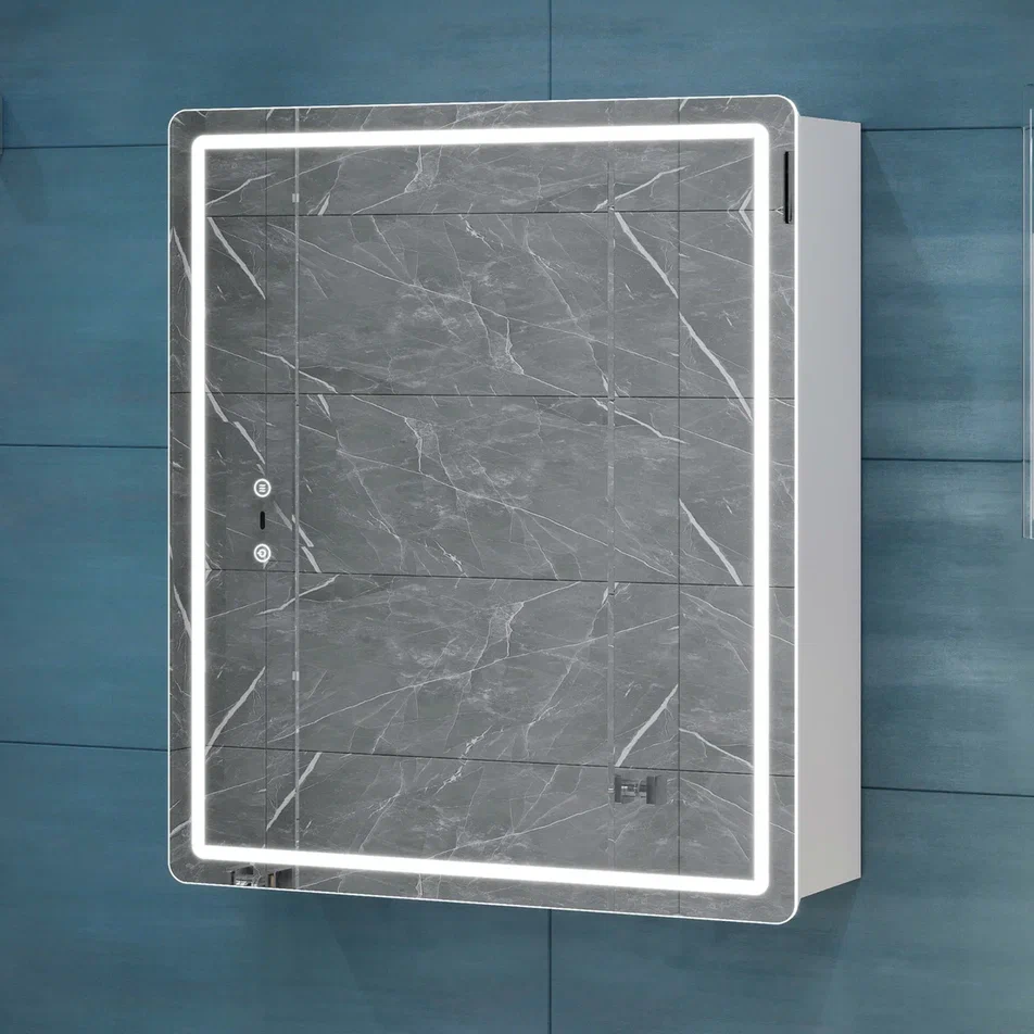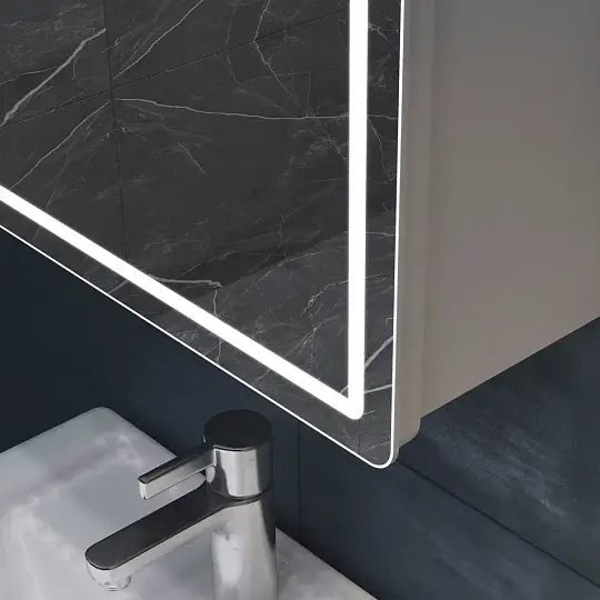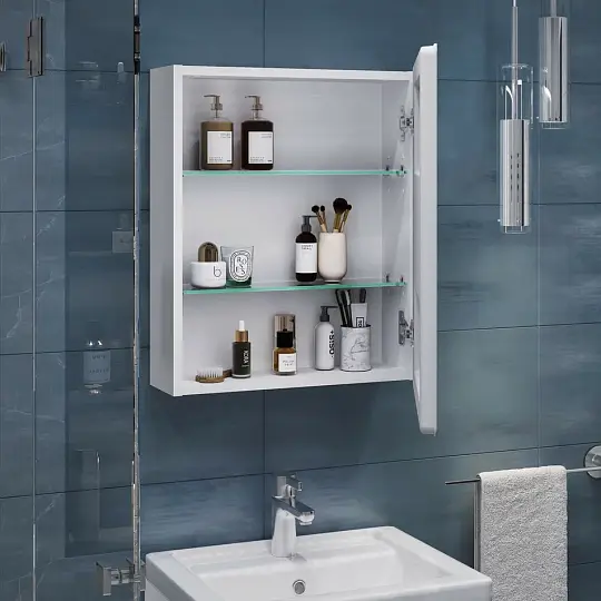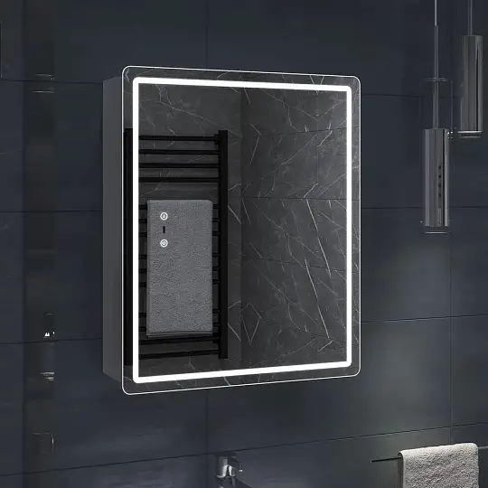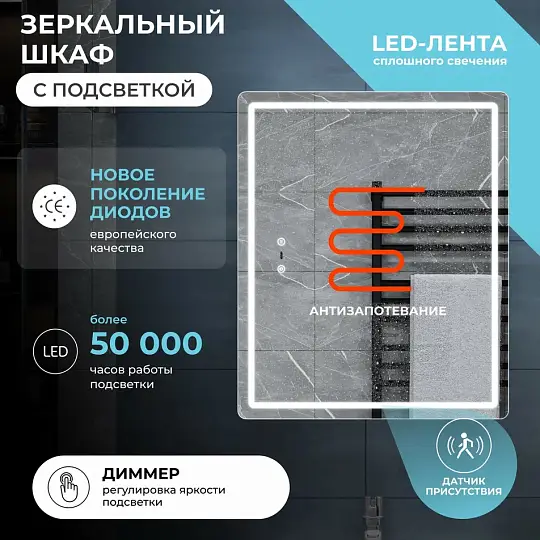 Зеркальный шкаф VIGO Geometry 455, 50 см: 1 дверца, петли с механизмом доводчика, 2 стеклянных полки, светодиодная подсветка по периметру, датчик присутствия, сенсорное включение, функция антизапотевания, диммер.