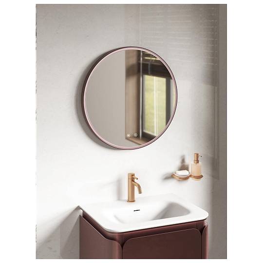 Круглое зеркало с диммируемой LED подсветкой и антифогом в цвете «бордо». Регулировка яркости и температуры в диапазоне от 3000К до 6000К. Сенсорное управление с помощью 2х кнопок на зеркальном полотне.