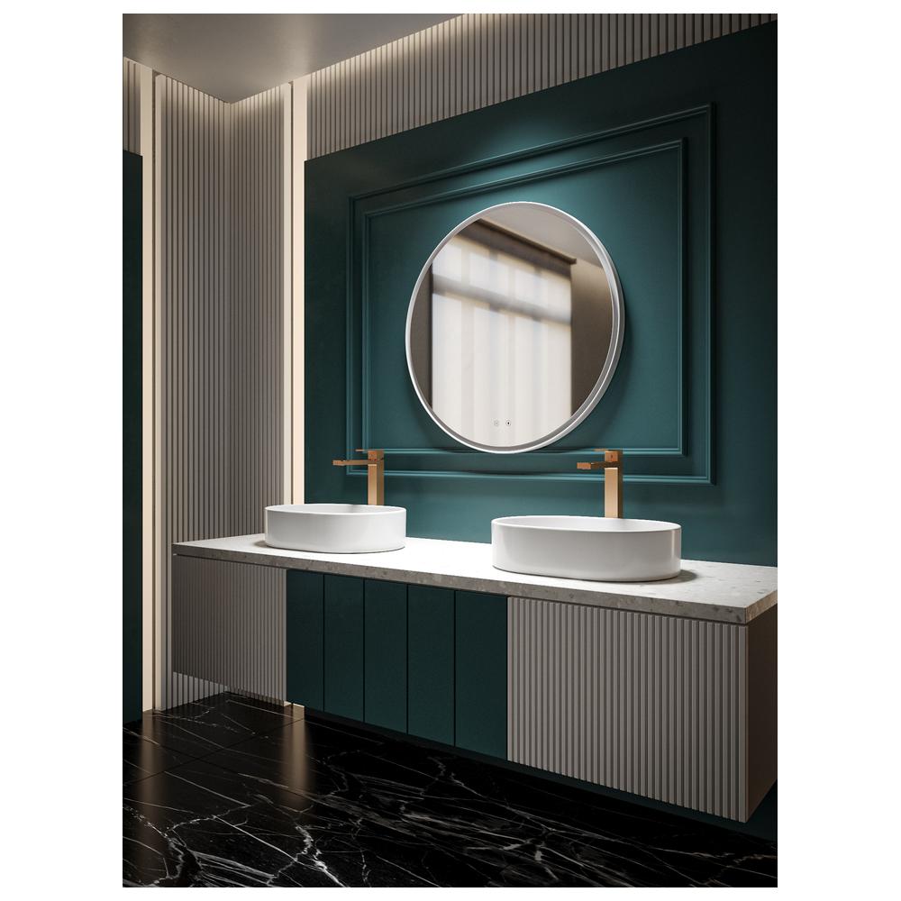 Круглое зеркало с диммируемой LED подсветкой и антифогом в матовом белом цвете. Регулировка яркости и температуры в диапазоне от 3000К до 6000К. Сенсорное управление с помощью 2х кнопок на зеркальном полотне.