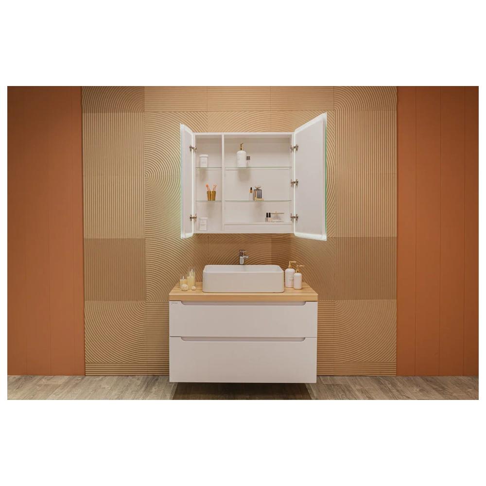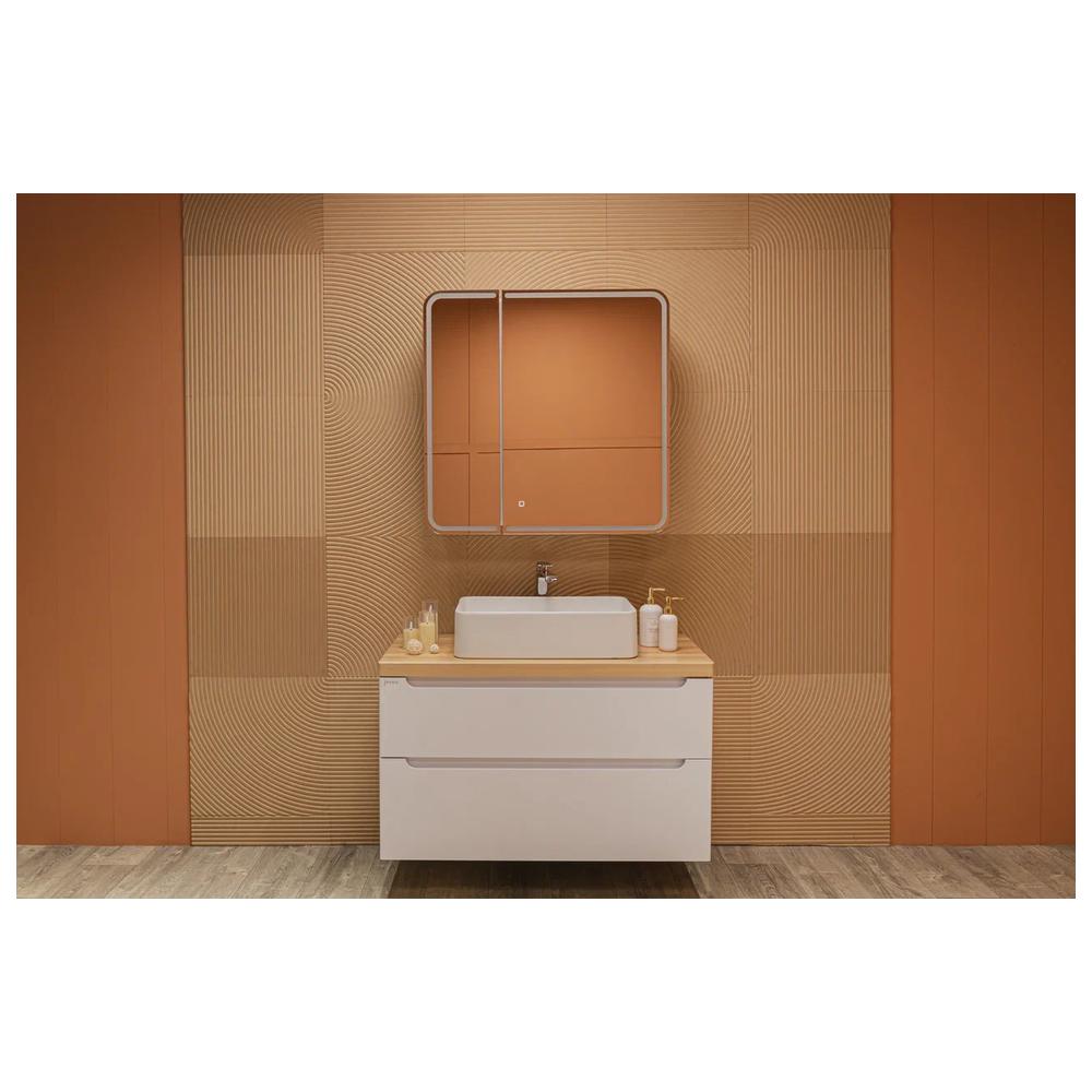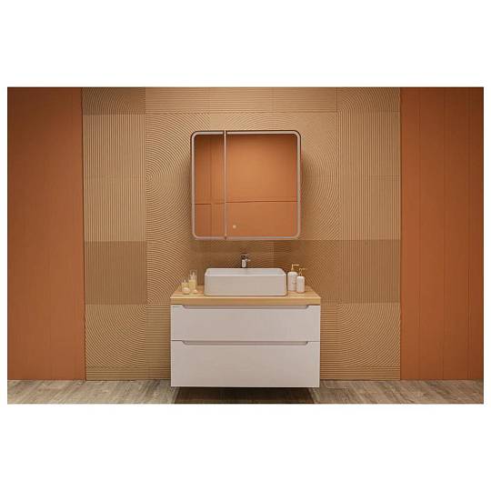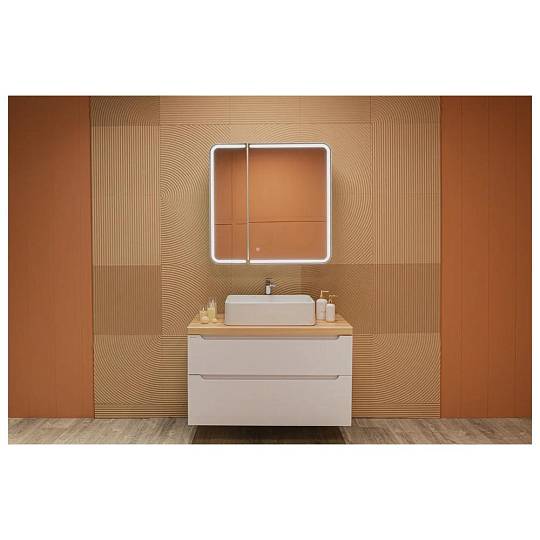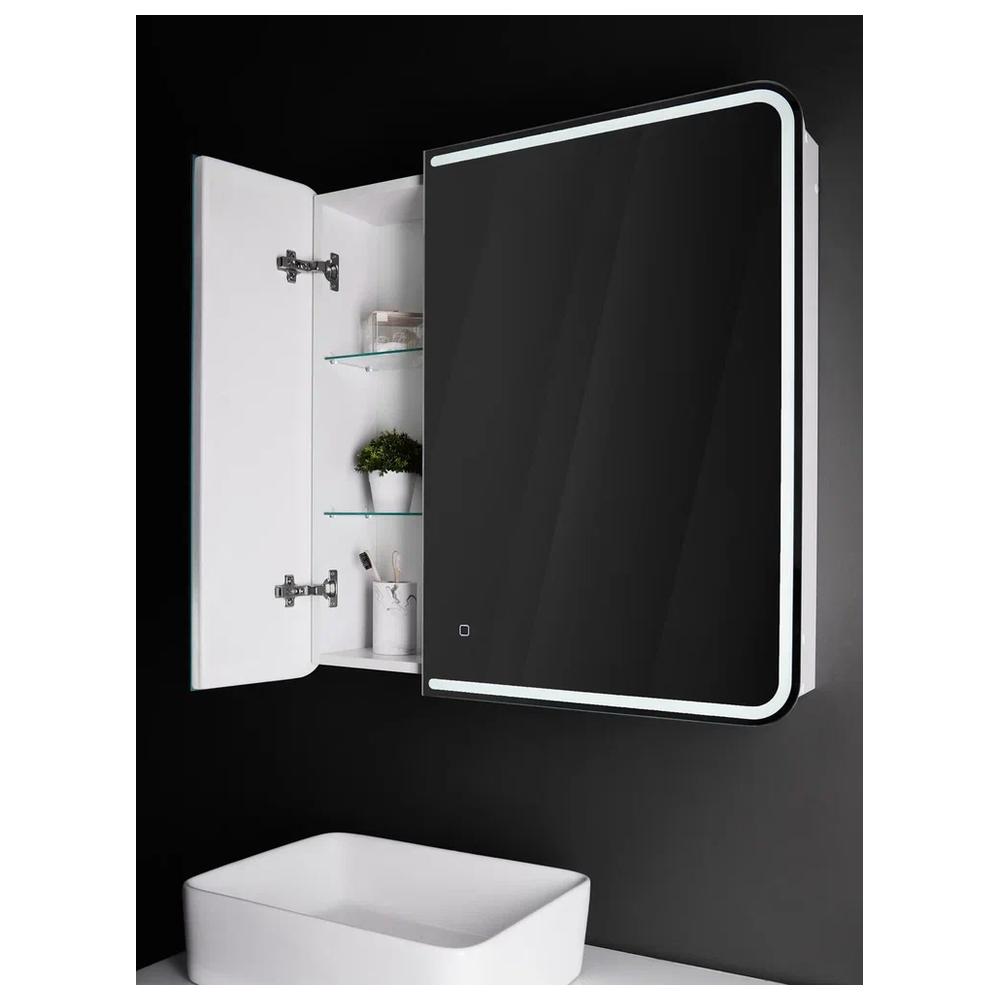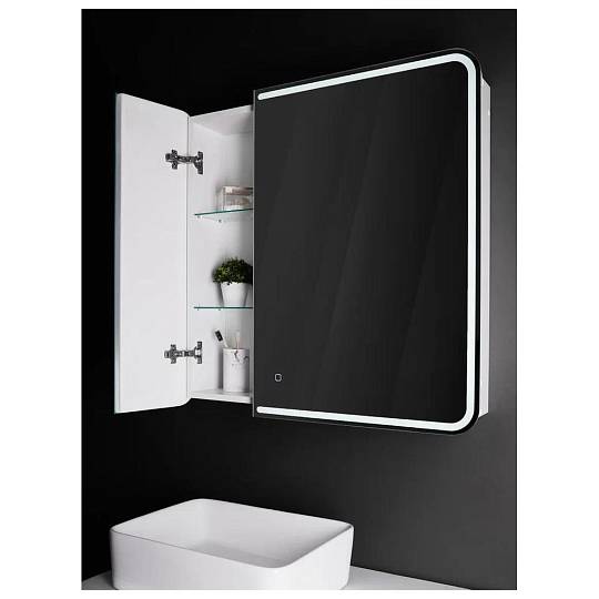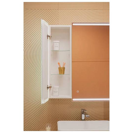 Создавая этот двухстворчатый зеркальный шкаф, мы вложили в него всю нашу страсть к утончённому минимализму и функциональности. Исключительный стиль задаёт контурное освещение фасада, которое визуально соединяет две половинки зеркального полотна в единое целое. Благодаря такому рисунку модель выглядит завершённой. Скруглённые углы зеркального полотна смягчают чёткие линии, «холодную» фактуру отделочной плитки и сделают интерьер ванной комнаты более уютным. «Дружелюбная» форма подчёркиваются при включении подсветки, регулируемой сенсорным выключателем с функцией диммера. Несколько полочек образуют вместительное и эргономичное место для хранения. Модель позволяет конструктивно использовать пространство, при этом зеркальный фасад полностью скрывают зону хранения. Доводчик для плавного закрывания дверцы и встроенная в боковую часть корпуса розетка делают зеркало-шкаф комфортным в использовании.