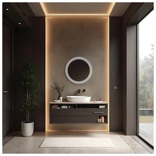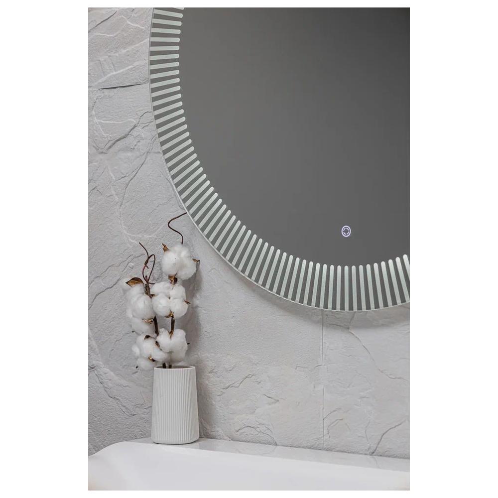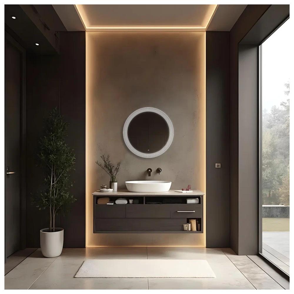 "Santy - S" D700 (бегущий свет, сенсорный выключатель) зеркало. Круглое, трендовое зеркало с функцией «бегущий свет». Пять режимов, выбор скорости (три диапазона) и плавное диммирование яркости помогут создать в интерьере особую атмосферу. Художественный рисунок подсветки обеспечивает направленное, мягкое освещение лица без теней и бликов и украшает интерьер. Управляется сенсорным выключателем. Функция диммера позволяет плавно отрегулировать яркость. Функция памяти предназначена для запоминания последней настройки яркости. Долговечное влагостойкое серебряное полотно от ведущих мировых марок AGC и Sisecam отличается идеальным отражением без искажений и самым высоким показателем коррозийной стойкости. Эстетичная полированная кромка делает зеркало безопасным в использовании.