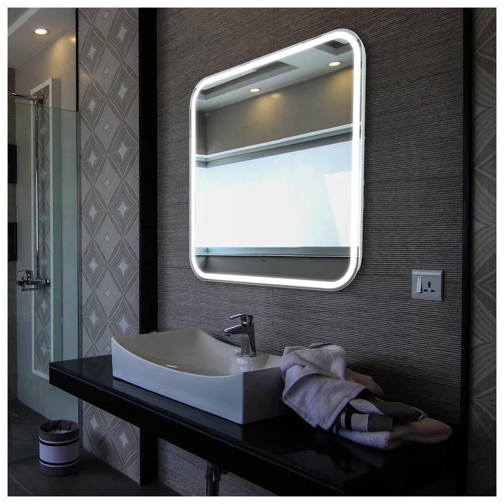 Stiv neo 800х800 (бесконтактный сенсор) зеркало. Особый характер этого зеркала – в комбинации прямоугольной формы, мягкой геометрии и LED-подсветки. Световая рама расположена не по краям периметра, а несколько отступает от него. Графичность рисунка и всей формы смягчают скруглённые углы. Благодаря такому сочетанию стильное, лаконичное квадратное зеркало органично впишется в любой интерьер — от консервативной классики до самодостаточного минимализма. Форма модели подчеркнёт упорядоченность пространства, а скругления смягчат строгие, чёткие линии интерьера. LED-подсветка по периметру, управляемая сенсорным выключателем с функцией диммера и усиливающая эффект смягчения, создаст приятную завораживающую атмосферу.