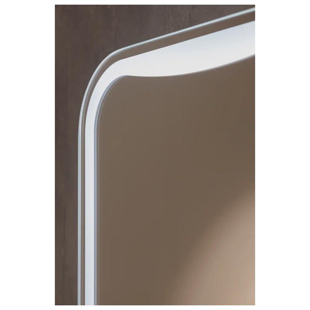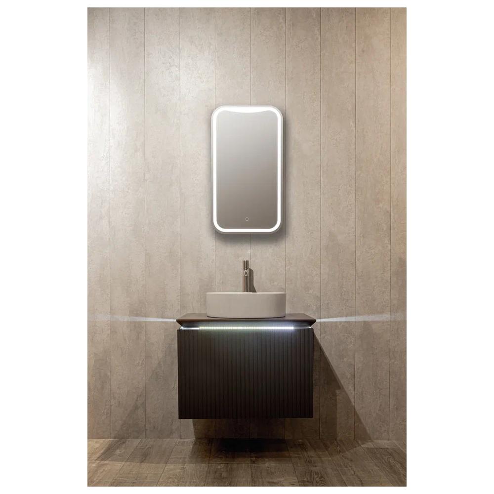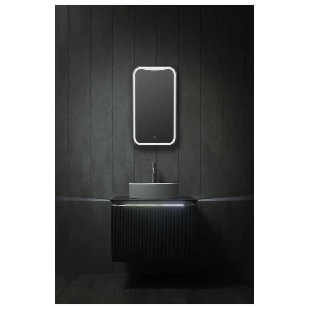 "Турин" 400х700 (сенсорный выключатель) зеркало. Прямоугольное вертикальное зеркало со скруглёнными радиусными углами. Рисунок LED-подсветки, управляемой сенсорным выключателем с функцией диммера, повторяет форму зеркала и тем самым подчёркивает «мягкую» геометрию модели. Особое внимание обращает на себя изменённая форма верхней полосы световой рамы. Эта деталь навевает мысль о застывшей снежной лавине. Благодаря дизайнерской находке лаконичное зеркало не выглядит строго, обладает внутренней динамикой, смягчит и оживит интерьер, станет яркой акцентной деталью пространства.